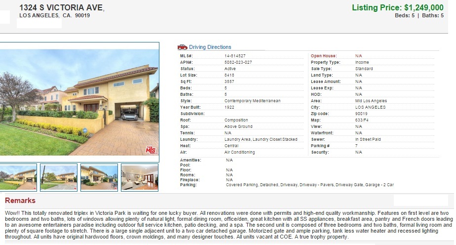 Wow!! This totally renovated triplex in Victoria Park is waiting for one lucky buyer. All renovations were done with permits and high-end quality workmanship. Features on first level are two bedrooms and two baths, lots of windows allowing plenty of natural light, formal dining room, office/den, great kitchen with all SS appliances, breakfast area, pantry and French doors leading to an awesome entertainers paradise including outdoor full service kitchen, patio decking, and a spa. The second unit is composed of three bedrooms and two baths, formal living room and plenty of square footage to stretch. There is a large single adjacent unit to a two car detached garage. Motorized gate and ample parking, tank less water heater and recessed lighting throughout. All units have original hardwood floors, crown moldings, and many designer touches. All units vacant at COE. A true trophy property.