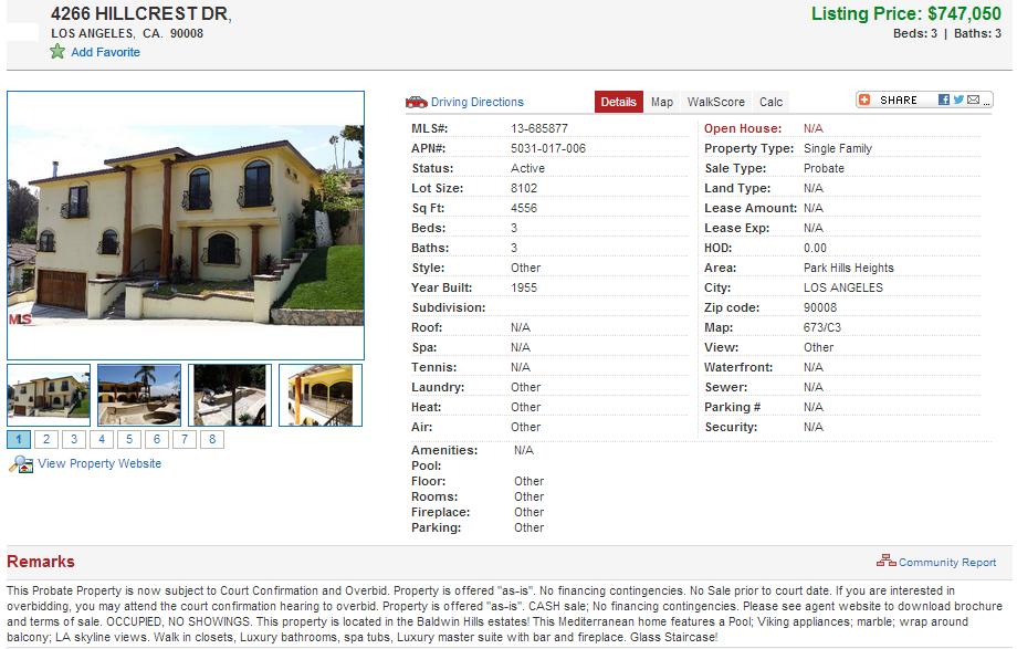 This Probate Property is now subject to Court Confirmation and Overbid. Property is offered "as-is". No financing contingencies. No Sale prior to court date. If you are interested in overbidding, you may attend the court confirmation hearing to overbid. Property is offered "as-is". CASH sale; No financing contingencies. Please see agent website to download brochure and terms of sale. OCCUPIED, NO SHOWINGS. This property is located in the Baldwin Hills estates! This Mediterranean home features a Pool; Viking appliances; marble; wrap around balcony; LA skyline views. Walk in closets, Luxury bathrooms, spa tubs, Luxury master suite with bar and fireplace. Glass Staircase!